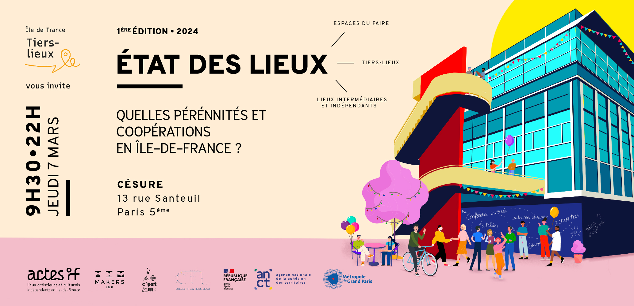Pour la première fois, le consortium Île-de-France Tiers-Lieux, regroupement des 4 réseaux de lieux franciliens (A+ c'est mieux !, Actes If, Makers IDF, le Collectif des Tiers-Lieux) a organisé le 7 mars 2024 à Césure, une rencontre régionale des acteur.ices des tiers-lieux.