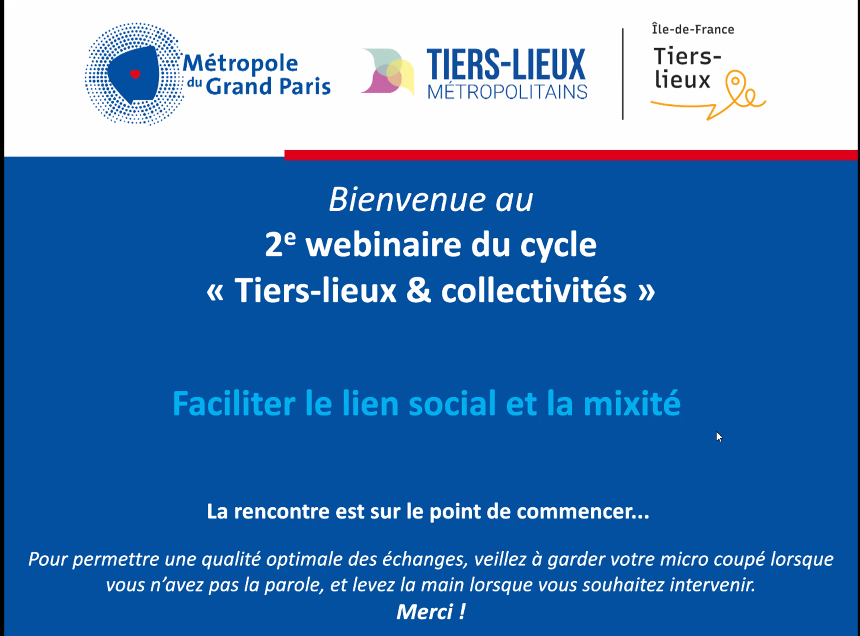 Ce deuxième webinaire est dédié à la thématique du lien social et de la mixité et au rôle complémentaire que peuvent jouer les tiers-lieux et les collectivités dans ce domaine.