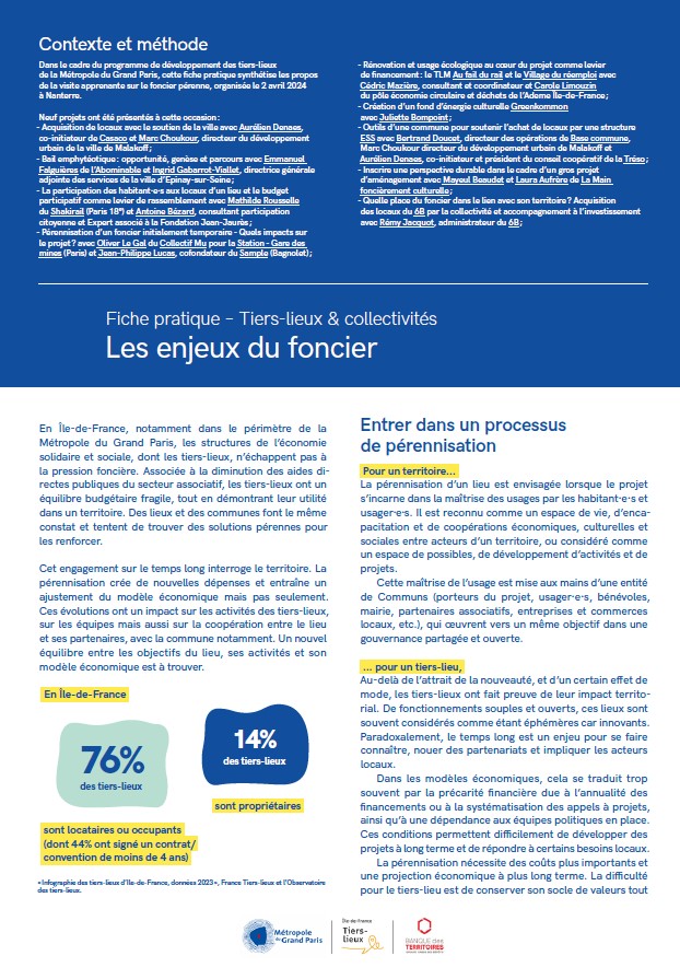 Une visite apprenante sur les questions de foncier pérenne a été organisée en avril 2024 à Nanterre, au Château d'Ethic. Près de 85 personnes ont participé et assisté aux 9 ateliers, dont les comptes-rendus sont disponibles.